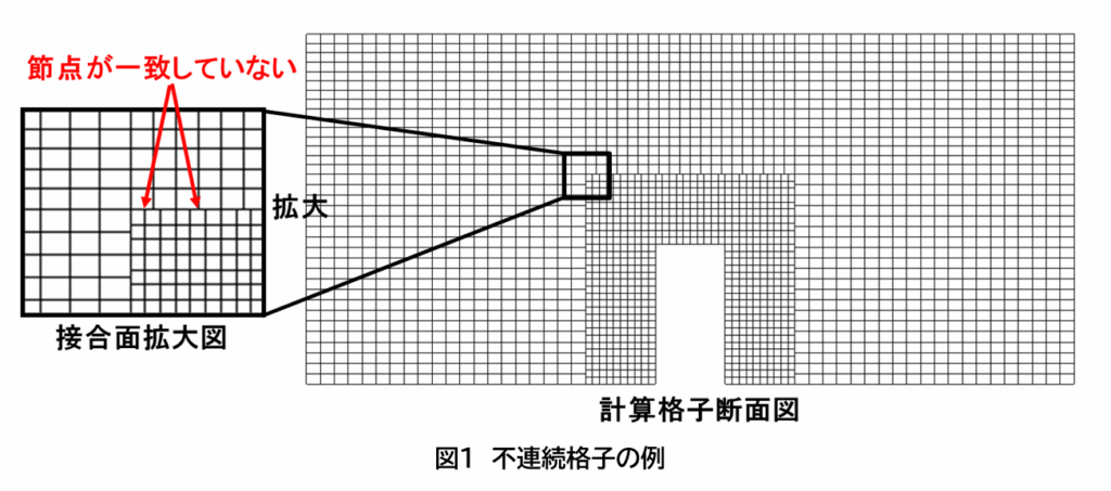 不連続格子機能とは、図1のような節点が一致しない格子の接合面で物理量の補間を行い解析する機能です。複雑な形状で通常の格子作成が困難であるとき、またはスライディングメッシュや移動格子など格子が移動する際に必須の機能となっています。今回、AFFrでは以下の機能を追加することで不連続格子機能の大幅な強化を行いました。