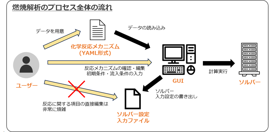 化学反応メカニズムデータ(YAML 形式)を読み込み、GUI 上で確認・編集が行えます。初期条件や境界条件も化学種組成や空気比などを指定するだけで一括入力され、複雑な燃焼解析の準備がより簡単に進められます。